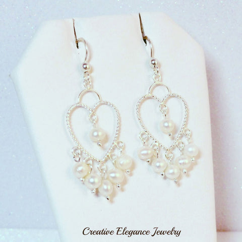 White Fresh Water Pearl, Dangle Heart Earrings, set in 92.5 Sterling Silver