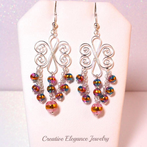 Beaded multi-color Chandelier Earrings, set in 92.5 Sterling Silver